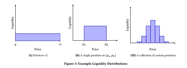 怎么集中流动性?通过限制做市区间,增加了可成交价格附近的流动性深度。如果把V2想象成一个无限宽的水槽,那V3就是由一个个极小单位(TICK)水槽并排组成的水槽,你可以把你的流动性(Token),撒进你感兴趣的价格区间,如果你的区间覆盖了成交价,就可以获得兑换费分成,否则就失去资格。