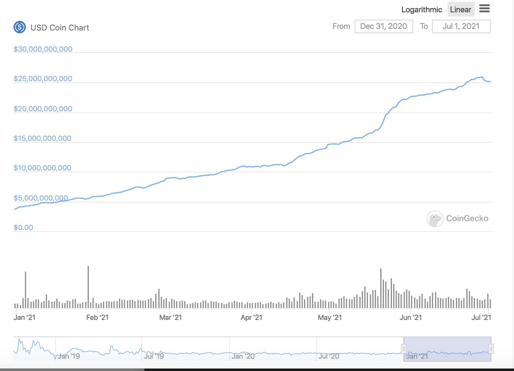 Tether (USDT)的增长曲线在5月21日前基本呈直线状,而随着市场降温后,其市场规模增长开始放缓,此外在DeFi领域,Tether (USDT)已经被USDC甩在了身后,而它也是当前为数不多市场占有率在下降的中心化稳定币项目(另一个是PAX)。