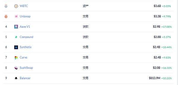 从锁仓量来看,Maker依旧占据第一位,Uniswap已经上升到第二位,其余的也都是近期涨幅较大的项目。