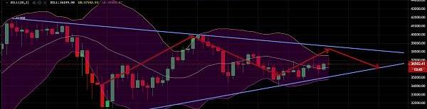 ?????受此影响BTC价格应声上涨,目前日线来看BTC近三天一直在回踩布林中轨线支撑,短期布林中轨线35150一带是短期较强支撑,现货不破中轨线耐心持币,等待灰度表演。四小时级别走势来看,形成了一个大三角整理形态,目前三角上轨在38900一带,三角下沿支撑在35200一带,继续在这个区间内维持局部高抛低吸思路,后续有机会向上冲击三角上轨目标位。压力位:38900,支撑位:35200。