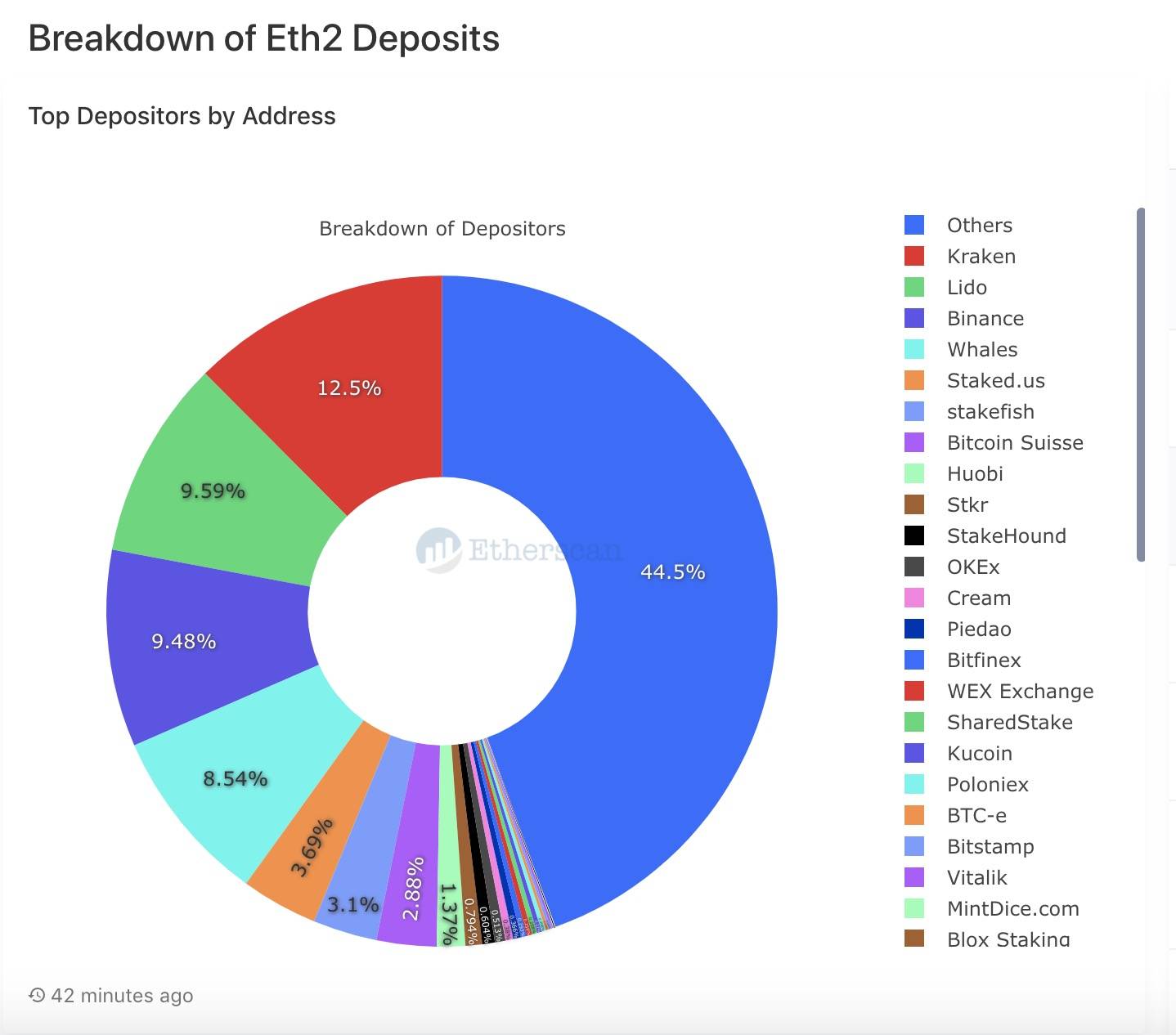 如上图所示,当前已公布地址的以太坊2.0质押服务当中,排名靠前的有Kraken交易所(77.4万ETH,占12.5%)、Lido(59.56万ETH,占9.59%)、币安(58.86万 ETH,占9.48%)、鲸鱼(52.99万ETH,占8.54%)、Staked.us(22.9万 ETH,占3.69%)、Bitcoin Suisse(17.88万 ETH,占2.88%)以及火币(8.48万 ETH,占1.37%),剩余有45.9%(大约276万 ETH)来自未知实体。