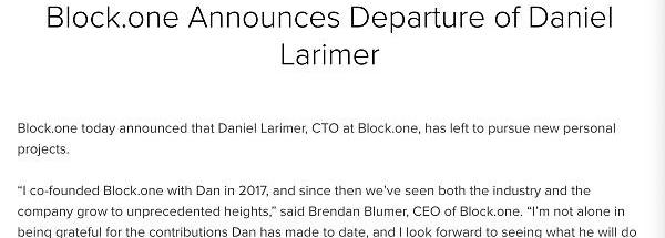 Block.one官网宣布Block.one的首席技术官DanielLarimer已经离职,去追求新的个人项目。Block.one的首席执行官BrendanBlumer对此回应,"我与Dan在2017年共同创立了Block.one,从那时起,我们看到行业和公司都发展到了前所未有的高度。"BrendanBlumer说。"我对Dan迄今为止所做的贡献表示感谢,很期待看到他接下来做的事情。"