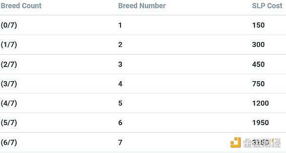 培育费用为4个AXS代币,而且该费用会根据繁殖次数而增加。例如,繁殖两个未交配的Axies需要300个SLP代币,然后再按比例增加,如下图所示。