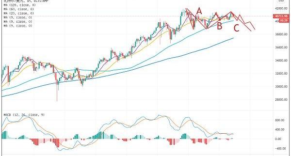 上图给大家画的是比特币1小时图的ABC浪的预测,昨天白天上演的是A浪中的abc下跌行情,晚上上演的是B浪中的abc上涨行情,今日比特币运行到大C浪,我们第一点可以确认的是今日大概率有继续下探昨日低点38800附近,至于它是以abc下来还是以1、2、3、4、5下来,这个不可确定预知,只能等行情走出来才知道,不过这里本人根据对波浪的了解,这波C浪的下来大概率应该以后面的形式下来。