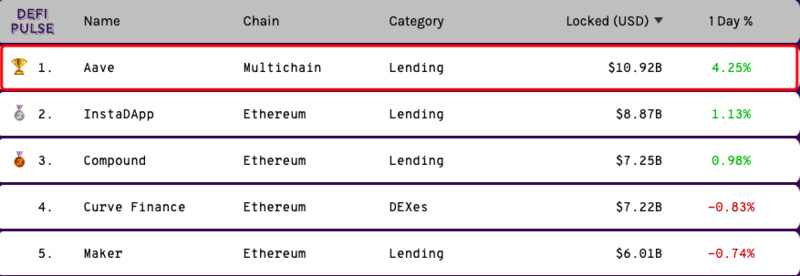 DeFi Pulse 最新数据显示,Aave 目前是最大的 DeFi 协议,其锁仓量达到 109.2 亿美元,位列首位。