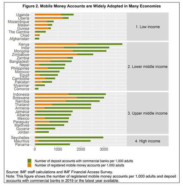 移动货币对低收入和中等收入经济体的金融部门格局产生了深远影响,为没有银行账户的人群提供了安全便捷的金融交易方式,并促进了金融包容性(IMF,2019a;Espinosa-Vega 等人,2020)。虽然非洲经常被认为是移动货币的中心,但在世界其他地区,包括亚洲和拉丁美洲,移动货币的使用也大幅增长。截至2019年,移动货币账户注册超过了10亿,每天通过这些账户发生近20亿美元的交易(GSMA,2020年a)。
