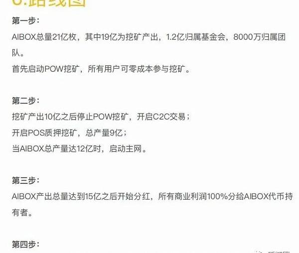 Aibox总量21亿枚,其中19亿为挖矿产?出,1.2亿归属基会金?,8000万归属团队?。首先启动POW挖矿?,所有用户可零?成本参与矿挖?。??,?挖矿产出10亿之?后停止POW挖矿,?开启C2C交易?,开启POS质挖押?矿,总产量9亿。当Aibox总产量达12亿时?启动主网。Aibox产总出?量达到15亿之后开始分红,所有商业利润100%分给Aibox代币持?有者。Aibox生态?建构了互联网群蜂?,正式构成新型隐私加密?互联网开放网络?。
