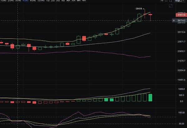 ??行情分析:从4小时图分析来看连续6连阳创新高位于最高点28418?在28418被压制下来暴跌1800个点??短时间内创新高是没有多大动力了?晚间操作建议逢高做空??