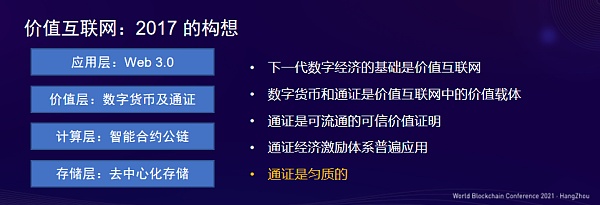 2017年的时候,我跟元道老师把 Token 这个英文单词翻译成通证,在行业内获得了认可和接受。回想2017年,当时我们对于价值互联网、区块链、未来的开放金融有很多的憧憬。比如当时我们觉得未来的价值互联网会有一个协议层专门用来表示价值;用通证、数字货币表示价值,我们想到通证经济能够调动千万用户的热情,能够创造新的增长模式,我们判断金融、互联网应用和游戏都将在区块链上重构。今天看起来,这些判断都是对的。