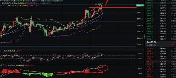 大饼不负众望,突破我们的压力24800附近,正如辰飞预想的一样,那么目前白盘的一个行情趋势来看,可以看到我们的一个多头依然是比较强烈的,小周期级别布林轨整体向上运行,MA,均线依托必嫁有力上行,那么白盘的行情多头已然明显,那么辰飞建议我们还是可以继续低多操作。