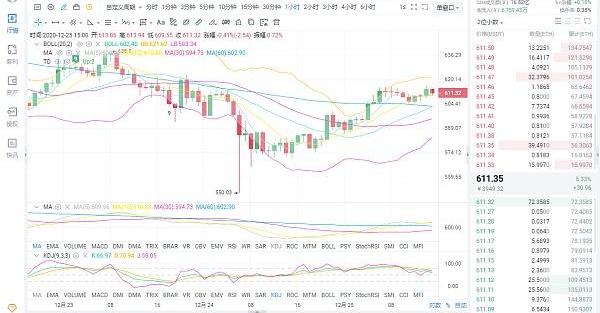 小时图来看,昨日行情呈向上形态,早间币价在615附近遇阻后一直处于调整。目前币价在613附近浮动。技术指标:布林通道呈现向上微微缩口姿态,MACD快慢线在零轴上方死叉。能量柱空头缩量。KDJ三线合理区高位粘合有向下散发趋势。综合来看目前行情还是处于横盘调整,还是以多单为主