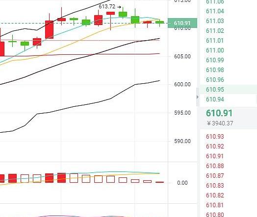 综合来看,目前的以太坊行情大趋势是一个回调做多的行情走势,目前短线下方的支撑位我们可以看到607-608一线的位置,行情回调下方的支撑位可以进行多单的进场,上方的压力位我们继续看到615-618一线,操作上依旧是回调做多的思路就好,不要逆势操作!