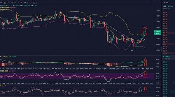 ?ETH经过整日的窄幅震荡后,跌破前方小支撑位置到达588低位,经过整日的低位震荡修复后,开始蓄力反弹,最高触及633一线位置,涨幅接近50点,这波反弹在意料之外却又在情理之中,因为从盘面看前期多次出现窄幅震荡后都出现了大的波动,非大涨即大跌。短线小时图来看,币价已经突破布林带上轨,MA5日线上穿MA10日线在605位置形成支撑,MACD,快慢线拐头向上散发,多头动能持续放量,且动能充足,KDJ,RSI均线拐头双双向下,说明短期会有小幅度回调。综合来看操作上建议回调622-620附近多单进场,意外见617位置补仓多单,统一止损612,目标看向632-642附近。