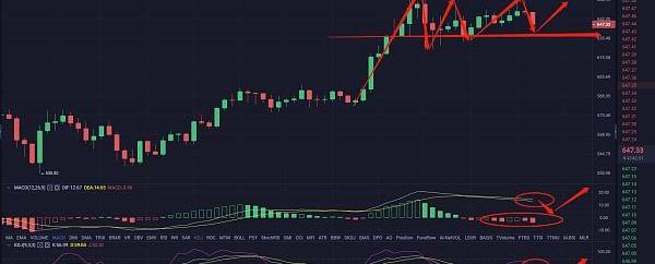 ??四小时级别布林带缩口,早间一波下破属于正常冲高回落,币价拉动均线MA5-MA10走平,但打周期MA30-MA60依旧为上行趋势,底部MACD指标再次放量,但动能并不充足,也就意味着即使下破,空间也不会不大,KDJ三线粘合向下发散,那么我们可以在下方637-631作为多单布控,目标看到665一带。发文有延迟,具体以泊君实时为准,场外跟单自行把控。