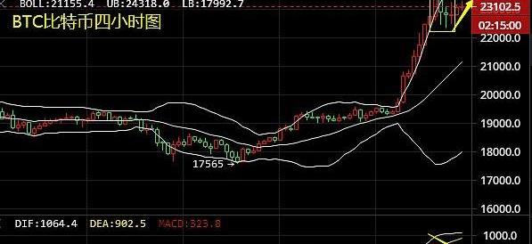 日线比特币在连续性的大涨之后渐渐进入调整阶段,BOLL呈开口状态,上行空间随着行情的调整愈发向上。日线技术形态背离还未得到有效修复,比特币创历史新高之后,上方暂无参考阻力位,短期的话可关注隔日高位23819美元一带,若继续向上突破的话,谈老师认为比特币的下一个目标就是25000美元,乃至3万整数关口,下方则需重点关注BOLL上轨位置22100美元一带支撑情况。