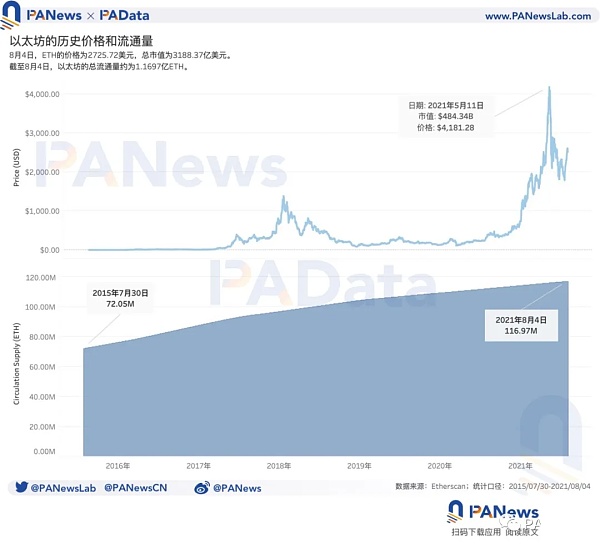 根据Etherscan的数据,最早录得的币价为2015年8月7日的2.77美元,当日市值为2亿美元。而到今年8月4日,ETH的价格已经飙升至2725.72美元,市值也扩张至3188.37亿美元,两者较6年前已分别翻了984倍和1594倍。以太坊的历史最高价格为今年5月11日的创造的4181.28美元,是创世初的2090倍,当日市值约为4843.42亿美元。