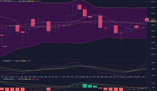 小时级别来看,行情区间内运行,多空争夺激烈,大家也是等着的很着急,目前布林带水平运行,MACD快慢线在零轴粘合运行,多头空头能量放量缓减缓,KDJ三线向上逐渐走平,行情触底支撑580逐渐开始反弹上行,可以说近段时间是一个很好的区间操作获取利润时间,无脑操作高空低多,关注支撑压力破位情况就可以了,那么我们接下来仍然还是保持的这各思路,当前币价585附近不建议进场,多空争夺点,风险大利润小不划算。