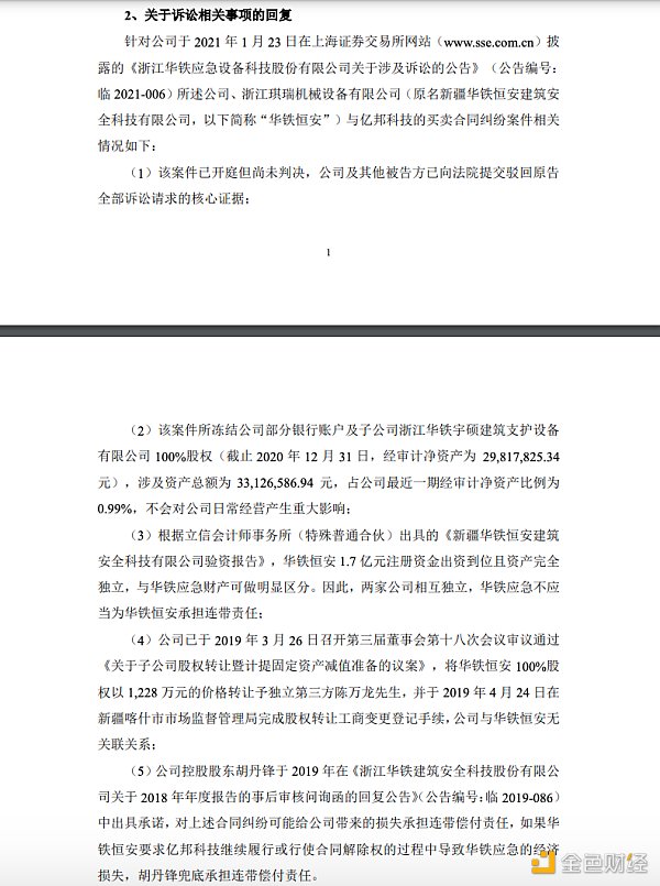 2020年12月,亿邦科技向杭州市中级人民法院提起诉讼,将浙江琪瑞机械设备有限公司(新疆华铁更名后主体)、华铁应急及公司实控人胡丹峰告上法庭,该案已在今年6月开过两次庭但尚未判决。法院已冻结了华铁应急部分银行账户和子公司股权。