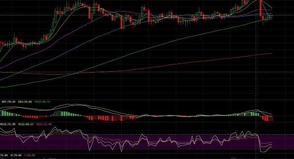之势,调整至19500附近,而后承压回落,现报价19100附近,附图MACD指标双线在结束将近一天的纠缠粘合后,位于零轴下方低位运行,