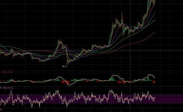 日线出现三连阳情况,多头已做好充分的准备,目前就只欠东风,只要量能放大,将有机会让价格触及2万美元,在目前多头趋势下,仍然建议大家逢低做多思路。压力:19600,支撑位:19000。上升后的持续横盘表明多方力量可能仍然比较强劲,短暂的盘整可能是在积攒力量,如果日内可以放量突破这一位置,上涨行情可能仍会继续,如果没有突破,市场可能继续在高位横盘。从日线级别来看,仍然处于绝对高位。日内关注成交量的变化以及前期高点的突破情况和下方19000整数关口的支撑情况。