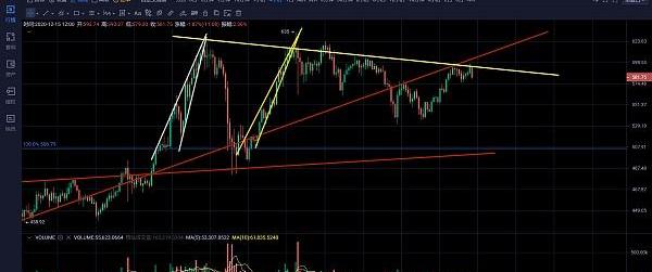 就在昨夜,美选举人团投票结果出炉,拜登获得306票高票当选美总统。消息影响下,美股道琼斯工业指数在昨夜北京时间23:30快速拉出历史高点30325.79点。但靴子落地后道琼斯工业指数尾盘收跌下破3万点整数关口。重大事件影响下,比特币随动美股多头涌动至19570美金,随如此比特币并没有站上12.1日阴线实体上沿即12.1日的开盘价格19695美金。且从当前比特币4小时结构上观察,仍然运行在12.1日高点19888形成后的大开口收敛结构当中。该结构在收敛三角过程中发生跌破,收敛交点位发生反弹进入北上象限。个人认为这种形式的反弹不符合一般多头行情出现后的窄收敛近交点位发生的突破。因此在进入北上象限后,只要比特币没有站上19695美金之上发生确定性的反转,行情依然有日线级别回调的需求。从日线这一角度观察,12.1日的阴线我认为是标志性的悟空阴线。近半个月所有的盘面震荡都是围绕此标志性阴线发生的。从时间级别和方向扭转角度出发可以观察到高点19888向下出现了4轮4小时级别下跌和一轮4小时级别的反弹。这种缓慢下跌快速反弹往往是行情要偏向于空头的表现。要知道牛市的进程往往是急跌缓涨,只有行情有继续下行意愿的时候才会出现当前盘面当中表现的缓跌急涨画面。因此在当前比特币再次进入收敛背侧的东落象限情况下,个人认为很快比特币会重新回到南下快速跌落和快速反弹象限。根据前面比特币下跌过程中形成的收敛三角构成的支撑,判断短时间比特币有下探17600美金的需求。