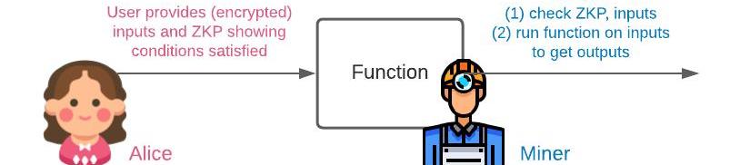 一个既能支持同态加法,又能支持同态乘法的加密方案是全同态加密。使用FHE,我们仍然可以遵循图6中所描绘的模型。也就是,用户指定加密输入,要运行的函数,以及证明加密输入满足必要条件的ZKP。矿工能够验证ZKP。他们使用同态加法和同态乘法直接对用户提供的密文进行操作。