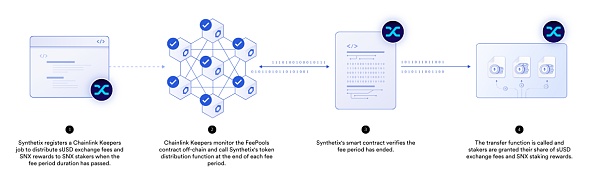 Synthetix是去中心化的衍生品协议,用户可以在链上获得超额抵押的合成资产,并以零滑点与流动性池合约交易。Synthetix将在交易费周期关闭服务(Fee Period Closing service)中采用Chainlink Keepers。Chainlink Keepers在交易费周期结束时将调用这个函数,自动分配synthetix.exchange的交易手续费和staking奖励。