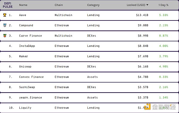 DeFi排名前十锁仓量 数据来源:DeFi Pluse
