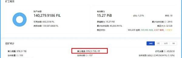 12月5日18:38从filfox上查看麦客存储节点号“f049911”给我们交上了一份满意的答卷,算力增速达到了978.31TIB/天,这不是简单的数字,快接近1PiB的算力意味着我们在高压的Gas费下还在付出更多。