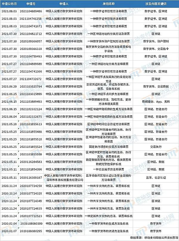 2020年-2021年上半年(截至8月初,下同)期间,数研所共计申请了30项专利,其中明确关于数字货币的仅有5项,涉及到区块链技术的有高达23项,包括数字证书、交易凭证、智能合约、数据处理、共享文件等多个方面。