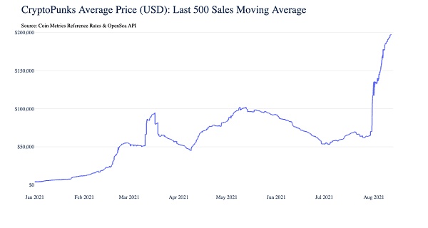 在这次“扫货”前,CryptoPunk的平均价格约为6万美元(之前的500笔交易),而自“扫货”后,CryptoPunk的平均价格已增至近20万美元。