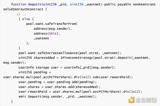 PineconeFarm合约的deposit()函数: