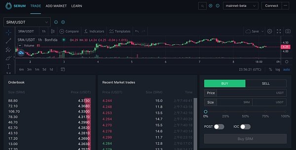 Serum生态中第一个应用是Serum DEX(去中心化交易所),用户可以在其上体验不到1秒的交易速度和极低的手续费成本。由于底层公链Solana的扩展性够高以及吞吐量足够,在Serum DEX上用户可以享受到中心化交易所所提供优质的服务——在订单簿上轻松挂单、撤单。