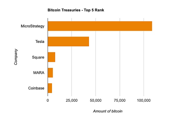而特斯拉则位居第二,仍然持有它在 2021 年初获得的 43,200 比特币。紧随其后的是 Square、Marathon Digital Holdings 和 Coinbase。金融科技支付解决方案公司 Square 目前持有 8000 多比特币,而比特币矿商 MARA 已在其资产负债表中分配了 5,425 比特币。美国最大的加密货币合规交易所 Coinbase 以 4,487 比特币的价格排名前五。