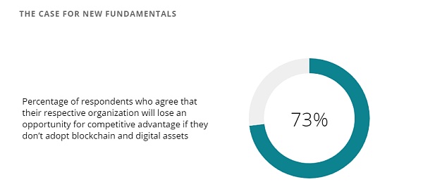 同意如果不采用区块链和数字资产,他们各自的组织将失去竞争优势机会的受访者百分比为 73 %。