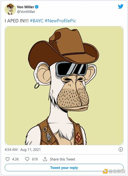 除此之外,还有许多来自丹佛野马队(Denver Broncos)的退役和现役球员,也投身“无聊猿”NFT。其中,线卫冯·米勒(Von Miller)就在8月初宣布自己购买了“无聊猿”NFT,此前,开球员布兰登·麦克马纳斯(Brandon McManus)和退役的野马队球员泰勒·波伦布斯(Tyler Polumbus)和布兰登·斯托克利(Brandon Stokley)也都进行了购买。事实上,波伦布斯在推特上说他曾拥有三个“无聊猿” NFT,然后将其中一个卖给了斯托克利。不仅如此,波伦布斯还表示,他拥有Micah Johnson的Aku NFT藏品,并发布了关于 Alphabetty NFT 的推文。