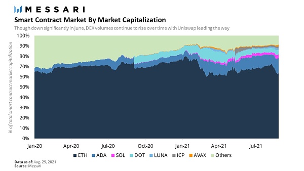 上图:自 2020 年 1 月以来,各大智能合约平台的市值变化情况。图源:Messari
