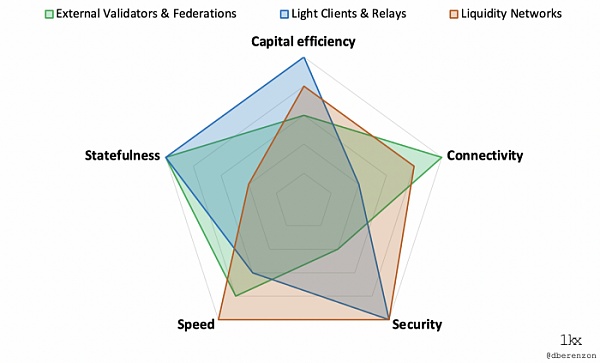 “流动性网络”在安全性和速度方面较强,因为它们是本地验证的系统 (即不需要全球共识)。它们也比抵押/投保机制的外部验证者机制更具有资本效率,因为资本效率与交易流/交易额有关,而不是与安全性有关。例如,假设两条链的交易流相等,再给定一个内置的再平衡机制,流动性网络可以促成任意大的经济吞吐量。