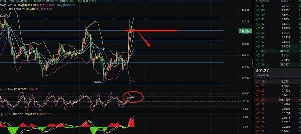 行情分析 从日线来看,昨日行情凌晨再次拉升,成功突破400一线阻力,最高到达408一线,行情在上方开始窄幅震荡,可以看出短期内400形成一个短期的小型支撑,从日线附图指标来看.