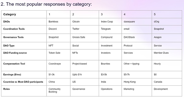 此外,调查报告还涉及这些DAO组织成员主要使用的底层区块链项目、最喜欢的DApp项目与最常用的Web3工具,靠前的底层区块链项目分别是以太坊、BSC、Solana、比特币与波卡,靠前的Dapp项目分别是Uniswap、Opensea、Sushiswap、Zapper与Gnosis safe,靠前的Web3工具分别是Poap、Snapshot、Gitcoin、Rabbithole与Gnosis。