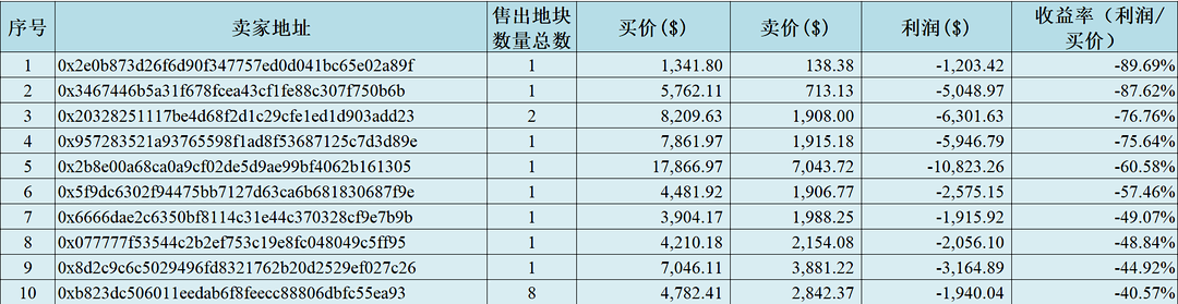 将截至 2021 年 8 月对一个地块同时有买卖记录的钱包地址进行汇总,发现该类地址共有 622 个,从 2018 年 6 月至 2021 年 8 月收益(卖价-买价)共 389 万美元。但是几家欢喜几家忧,下面列出了收益倍数最大的前十名钱包地址(图 3)、亏损率前十名钱包地址成交情况(图 4),收益倍数最大的地块和亏损率最大的地块(图 5)。