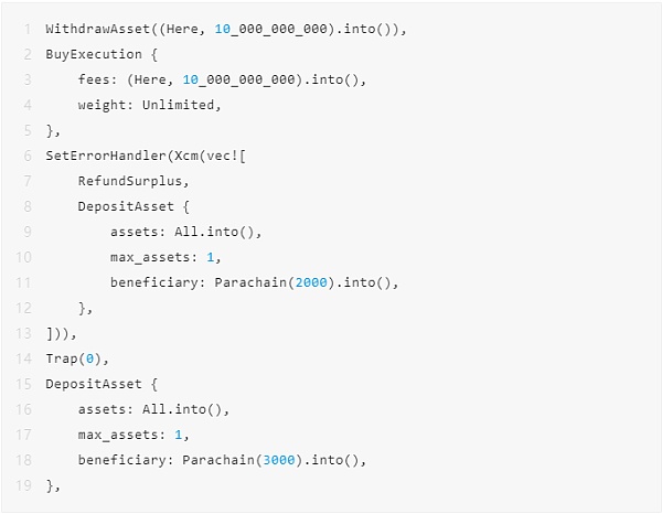正如您所看到的,唯一的变化是引入了两个 Set Appendix 指令,确保 Statemint 和 parachain 2000 中的错误或缺乏错误将报告给中继链。这假设中继链已经设置为能够识别和处理来自 Statemint 和 parachain 2000 的 Query Response 消息,查询 ID 为 42 ,权重限制为 1000 万。令人高兴的是,这确实是基板支持的东西,但超出了范围。