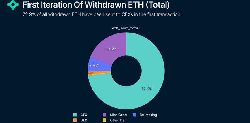 上面的图表显示了被提取的ETH被发送到哪里的第一次迭代的细分,这让人们了解了提款者用他们的ETH做了什么,并有助于衡量提款者立即或短期内的一些抛售压力。