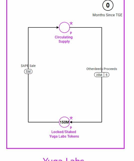 在这个假设的图表中,我们可以观察到几个事件正在发生。每个月,500万个APE代币通过预定的代币解锁和质押奖励进入流通。此外,我们可以看到每个月有1,000个APE代币通过在Yuga的手机游戏中出售SewerPassIAPs被转移回到$APE储备库中。