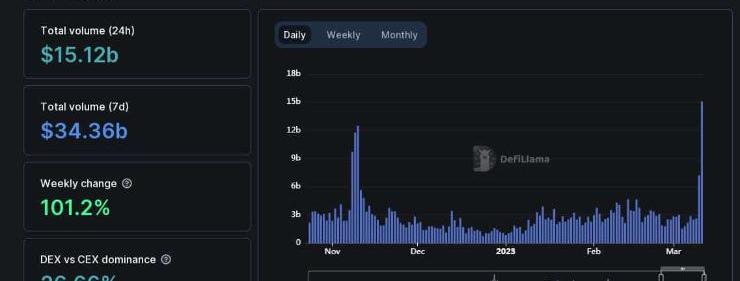 根据DeFiLlama数据显示,3月11日,DEX总交易额飙升至151.2亿美元,创下过去四个月新高,周增长率超过100%,其中Uniswap收取的费用收入也达到了自2022年5月10日以来的最高值,聚合DEX和中心化交易所(CEX)交易额比例上升至26.66%。
