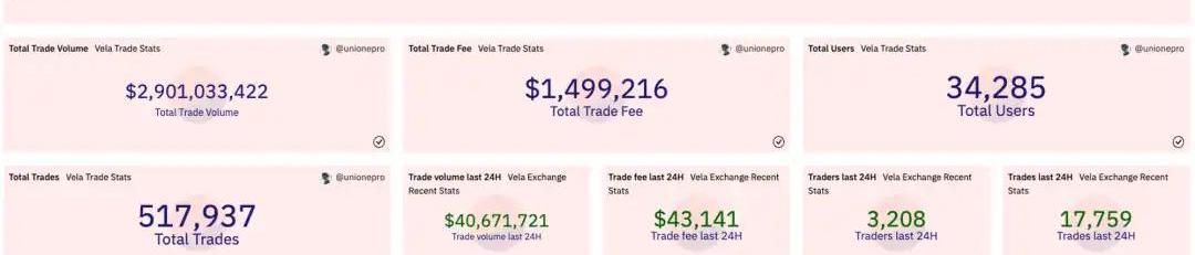 截至目前,拥有VC支持的Vela在上线短短几周内拥有近30亿美金的交易量,产生了仅150万美金的交易费用。配合近期的交易激励活动,Vela数据仍呈现明显的上升趋势。