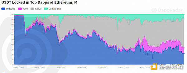 就 USDT 而言,我们能够观察到 Tether 供应量一直在 dApp 之间转移,这意味着价值并没有“流出” DeFi 领域。