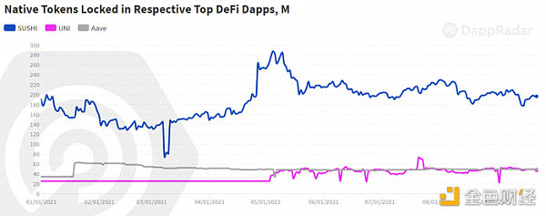 最后,以太坊区块链上顶级 DeFi dApp(比如 Aave、UNI 和 Sushi)原生代币供应量都保持了稳定增长,同样表明价值并没有“以相当大的方式”从 DeFi 领域里流出。