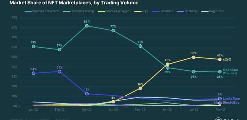 最大的NFT市场—以太坊的OpenSea占据了交易量的最大份额。但最近几个月,后入场的「潜力股」X2Y2已经慢慢从OpenSea手中抢走交易量,并在最近一个季度超越了OpenSea。