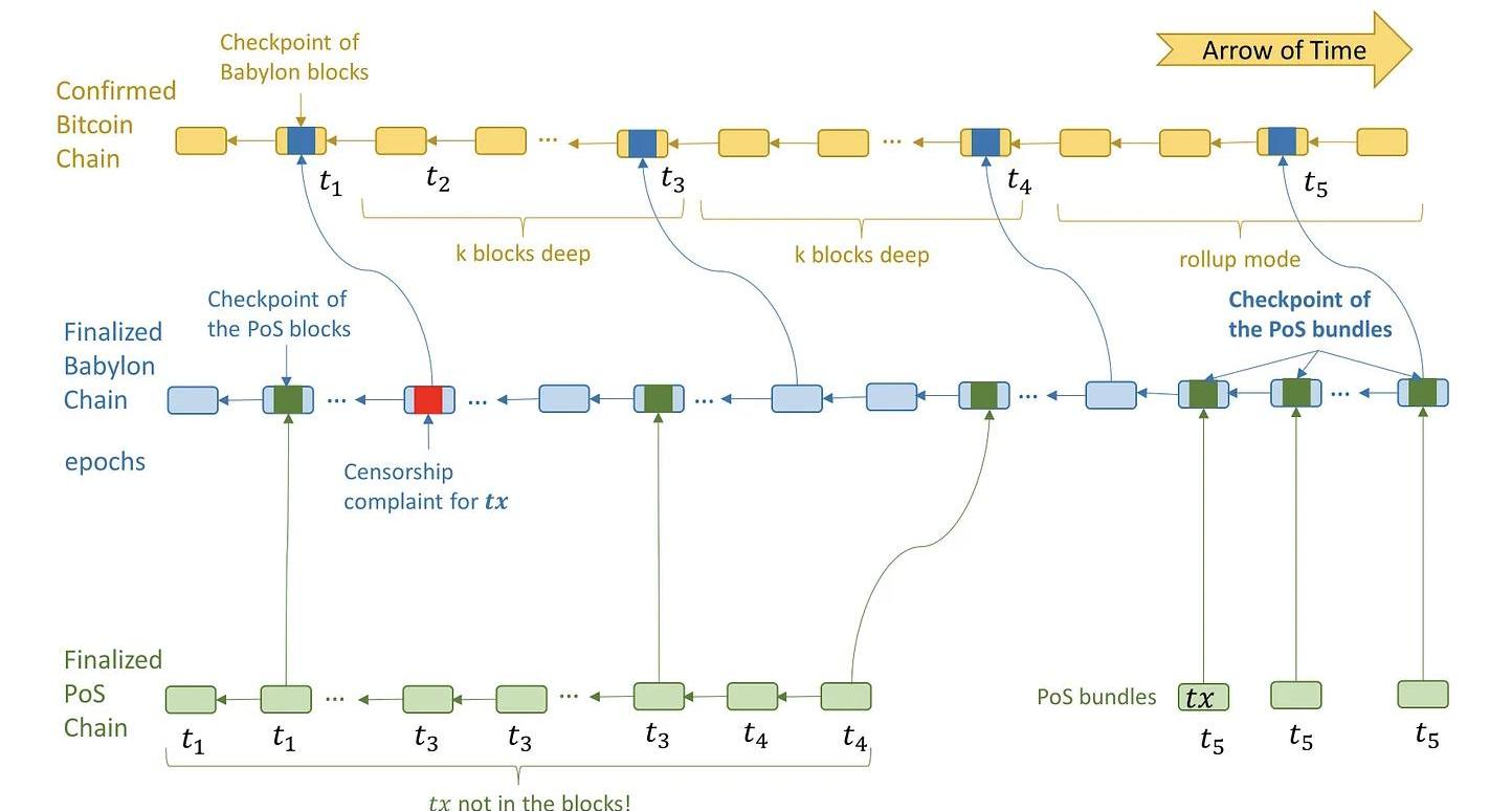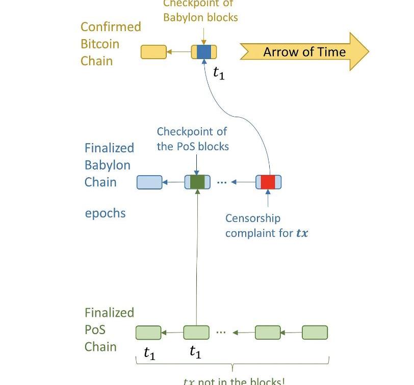 为了尽量减少对Babylon的信任以准确检查PoS区块,各个PoS链的验证者下载Babylon区块,并观察其PoS检查点是否包含在比特币检查的Babylon区块中。这使PoS链能够检测到差异,例如,如果Babylon验证者创建了一个由比特币检查的不可用区块,并对不可用区块中包含的PoS检查点撒谎。协议的主要组成部分描述如下: